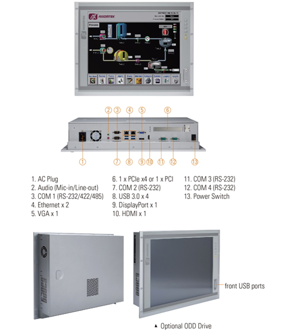 - 4组COM (1组RS-232/422/485)、4组USB 3.0、2组USB 2.0、1组PCIe x4或PCIe扩充界面