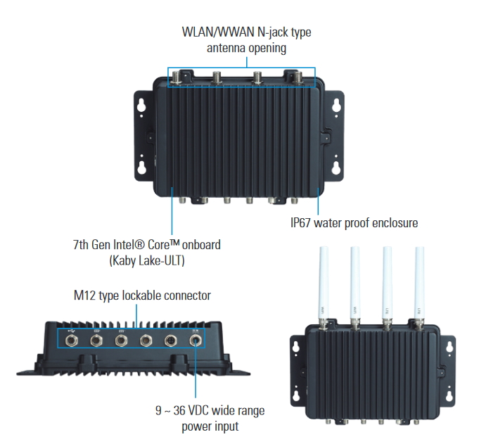 艾讯科技很荣幸地介绍全新IP67全机防水无风扇嵌入式电脑系统eBOX800-511-FL;配备M12锁固型防水连接器,强固机身支援零下30°C至高温60°C宽温操作范围,具有电源保护功能,拥有宽电压9 ~ 36VDC电源输入、M12新型快插式防水接头与N-jack防水型天线开口,专为户外严峻环境的关键应用 (例如设施状态监控) 而打造。内建第7代Intel® Core™ i5-7300U或Celeron® 3965U中央处理器 (原名称Kaby Lake),配备1组204-pin最高达16GB的DDR4-2133 SO-DIMM插槽系统存储器,较以往机种提供更显著的运算效能。