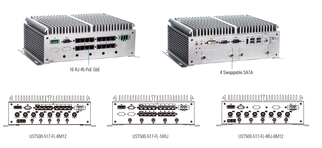 艾讯科技郑重介绍全新车载、轨道交通专用无风扇模块化嵌入式系统UST500-517-FL。搭载LGA1151插槽第7代Intel® Core™或Pentium®中央处理器 (最高至65W TDP),内建Intel® Q170高速芯片组,整合16组PoE埠提供RJ-45或M12连接器用于IP摄影机;提供全方位的系统电源保护,包括ACC on/off 延迟、关机延迟与高低电压保护的智能车辆电源管理技术。支援零下40°C至高温70°C宽温环境操作耐受范围,可承受高达3 Grms震动力,并且符合E-Mark、EN 50155等交通运输车载专业认证。