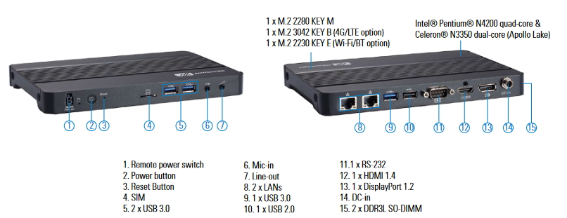 - 搭载Intel® Pentium®中央处理器N4200或Celeron® N3350 中央处理器 (Apollo Lake)