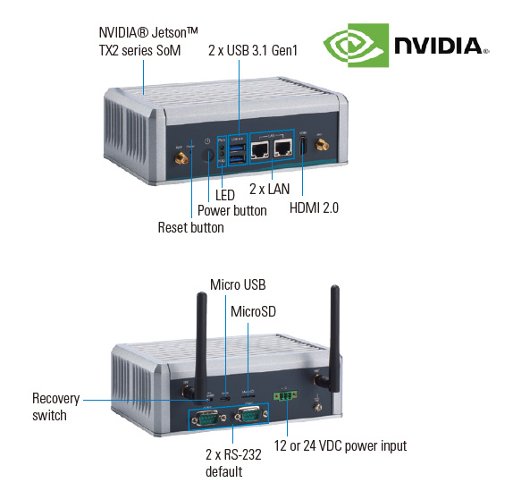 - 采用NVIDIA Pascal™架构256 CUDA®核心NVIDIA Jetson™ TX2人工智能超级电脑模块