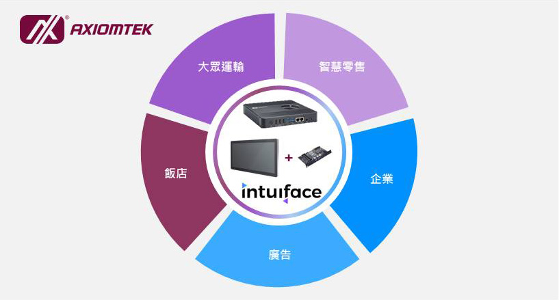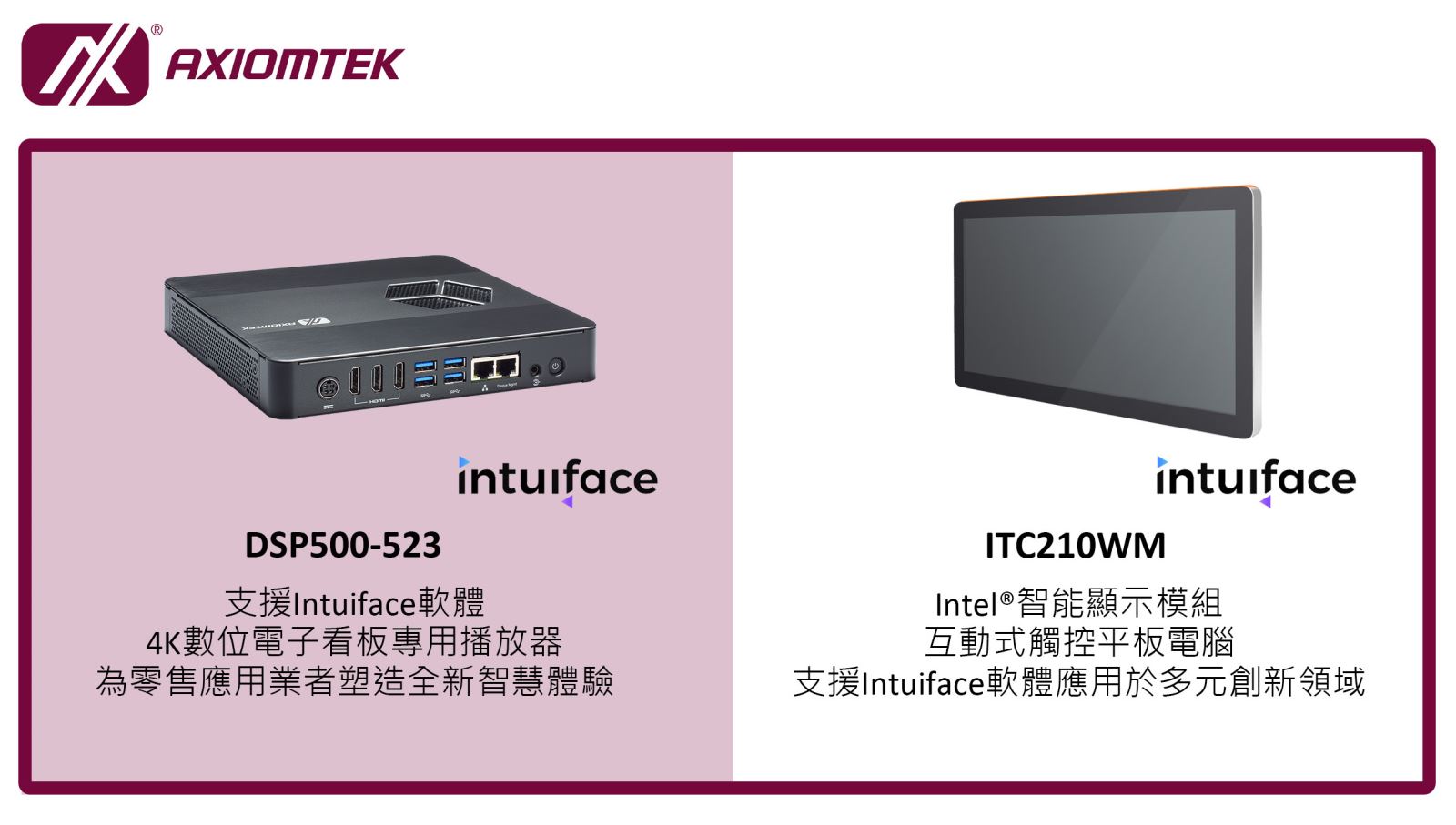 艾讯4K数字电子广告牌专用播放器DSP500-523与21.5寸Intel® SDM模块化平板电脑ITC210WM已经开始支援Intuiface软件。若需要更多产品信息、任何技术支援或报价,请参考艾讯大陆地区网站www.axiomtek.com.cn。您可来信axcn@axiomtek.com.cn及洽询艾讯区域业务,以获得专属且更有效率的服务。艾讯更提供全面客制化服务,欢迎对ODM/OEM有兴趣的厂商与我们联系。