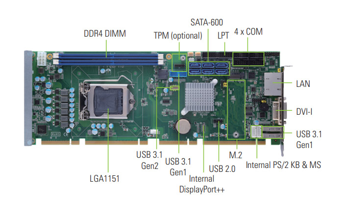 高效能Intel® Xeon®等级PICMG 1.3全尺寸单板电脑SHB150R配备2组288-pin最高达64GB的DDR4-2666/2400 Long-DIMM插槽系统存储器;提供1组附PCIe x4界面M.2 Key M 2280固态硬盘插槽 (Intel® C246或Q370),透过DVI-I与DisplayPort++ (内部插头) 最多能提供三显功能 (Intel® C246或Q370),给予浏览者真正高画质的视觉体验。功能强大的工业单板电脑兼容于Windows® 10与Linux主流作业系统,同时支援不间断的看门狗计时器 (watchdog timer) 与硬件监控功能,并能承受高温60°C的工作环境,以确保跨平台稳定可靠地运作。
