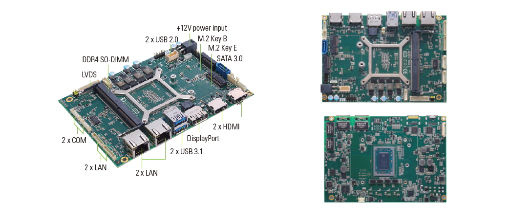 透过2组HDMI、1组DisplayPort与1组LVDS等显示界面,CAPA13R提供4组独立显示。中央处理器安装在板卡背面,不仅有助于散热,更提供灵活性,方便系统整合与降低维护作业。3.5寸嵌入式平台支援+12V直流电源输入,配备1组M.2 Key E插槽支援无线网络通讯,以及1组M.2 key B插槽支援资料储存;另内建1组260-pin最高达16GB的DDR4-2400 (V1605B) 或DDR4-3200 (V1807B) 的SO-DIMM插槽存储器。