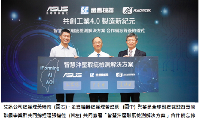全球知名领导厂商 - 艾讯股份有限公司 (Axiomtek Co., Ltd.) 持续致力于研发与制造一系列创新、高效能且可靠的工业电脑产品,深耕工厂自动化、智慧金融、智慧医疗以及智慧城市等应用领域。日前携手金丰机器与华硕电脑合作瑕疵检测解决方案,总经理黄瑞南与业务暨营销副总林若男昨天 (7月15日) 专程南下,与金丰机器总经理曾盛明及华硕全球副总裁张权德正式签署合作备忘录,三方共同为异业结盟写下崭新的一页。