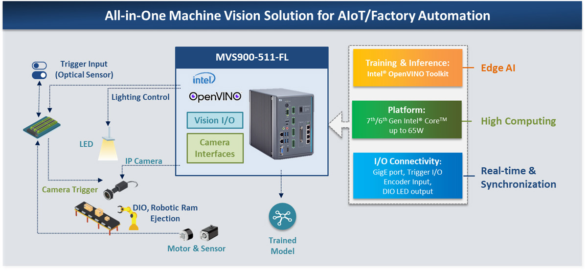 艾讯科技为满足现今工厂自动化生产对高质量与弹性的需求,全新推出一款多功能无风扇机器视觉系统MVS900-511-FL,拥有实时视觉I/O与相机界面。视觉I/O包括触发输入、触发输出、LED照明控制、正交编码器输入和隔离DIO界面。强大的视觉平台配备4组支援IEEE802.3at GbE LAN界面 (PoE) 功能的主流GigE相机,为自动光学检测 (AOI) 支援区域扫描和线条扫描功能。独家支援Intel® OpenVINO™工具组,不仅可以进行训练,更能进行推理,有助于发现生产流程的缺件,确保生产线上的每个产品都符合质量标准,快速又有效地实施电脑视觉与深度学习解决方案,充份满足智慧制造与AIoT应用领域的需求。