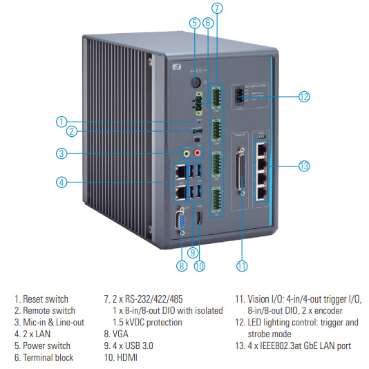 智能型视觉平台系统MVS900-511-FL支援2组最高达32GB的DDR4-2133/2400无缓冲SO-DIMM插槽系统存储器,提供2组易抽换2.5吋硬盘机固定架,满足大量储存需求。配备4组PoE接口、2组RS-232/422/485口、1组隔离式8-in/8-out DIO口、4组高速USB 3.0接口、1组HDMI接口、1组VGA接口、1组Mic-in/Line-out音频装置以及1组内部USB连接器等丰富功能界面;另提供1组电源开关、1组远端开关、1组重新啓动开关、1组3-pin接线端子以及AT/ATX快速开关。同时支援可信赖平台模块TPM 2.0功能,大幅提升安全性。