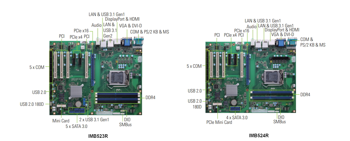 - 内建Intel® Q370 (IMB523R) 与H310 (IMB524R) 高速芯片组