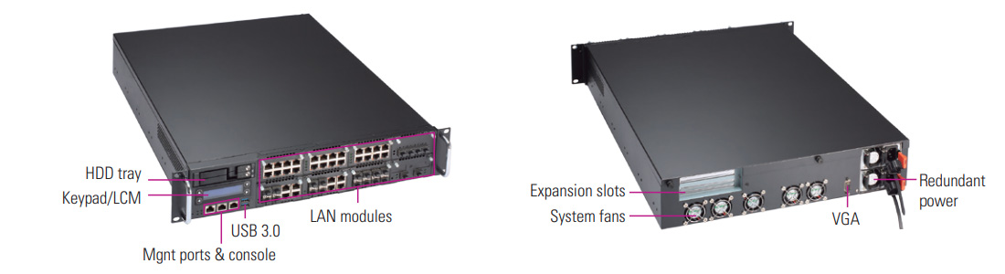 2U机架式双处理器网络应用平台NA870拥有8至40强大核心、宽带、多功能以及不同功率,优化许多工作负载类型与效能等级,足以因应各种网络应用领域。配备2组Gigabit以太网络端口与8组可扩充NIC模块,支持高达66组局域网络端口,拥有1GbE/10GbE/光纤/铜缆/Bypass等功能。同时,配备20组高容量达1280GB的DDR4-3200 R-DIMM系统内存,前面板有2组热插入2.5吋SATA硬盘机固定架与2组支持PCIe与SATA信号以进行储存扩充的M.2 Key M 2242/2280插槽,满足大量储存的需求;另提供2组PCIe x16扩充插槽,方便日后安装转接卡。