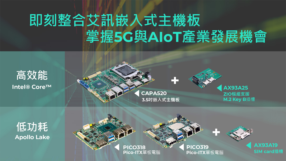 艾讯科技很荣幸发表支持高速5G网络的高效能3.5寸和低功耗Pico-ITX嵌入式主板CAPA520、PICO319与PICO318,提供边缘到云端地无缝链接,提升数据处理与传输效能,加速AIoT人工智能物联网解决方案。