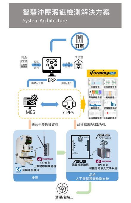 冲床制造厂龙头金丰机器对于艾讯在智能制造应用领域的佳绩深具信心,在TIMTOS x TMTS 2022特别规划展示,精选艾讯Intel® Xeon®高效能强固型无风扇AI边缘运算系统模块化系统IPC974-519-FL,并结合完整物联网工业级网关解决方案ICO300而成的「智慧冲压瑕疵检测解决方案」,方便在工作现场实时收集关键生产及设备信息。同时,更进一步导入ASUS IoT AISVision智能视觉软件工具包,并预安装相机与适当光源,当冲压品件完成冲压后,随即完成拍照及检测,轻易判读瑕庛品并移除。全功能冲压机台不仅能有效地搜集生产实时数据,透过大数据分析让金属冲压机构件业者一目了然生产机具的e化信息,更将制程阶段的产品质量全程纳入追踪,以进行标准作业流程的持续改善,达到提高设备使用率、提升生产质量,稳定持续地维持工厂总体系统的最佳状况,成功把传统冲床制造推向智能制造,并加速客户迈向数字转型之路。