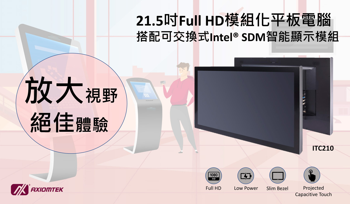 艾讯科技全新推出21.5寸模块化触控平板电脑ITC210,支持最新的Intel®智能显示模块 (Intel® SDM) 架构,交换式设计更容易进行现场系统的维护、更换和升级,加入国际标准防水防尘保护设计,为智能零售和轻工业提供更优质的观看与协同工作体验。