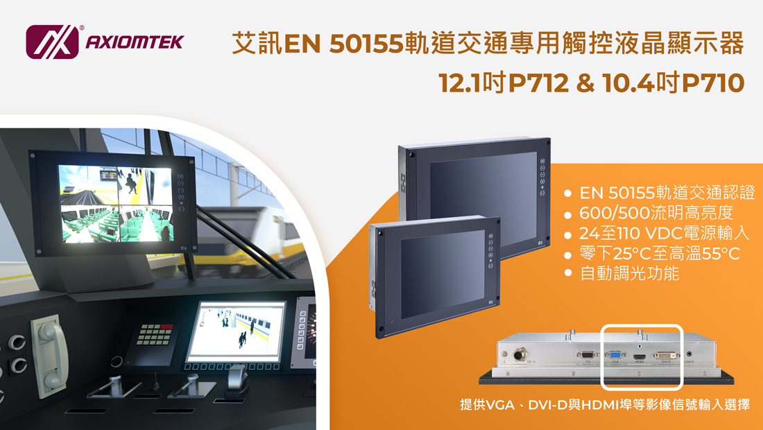 艾讯全新EN50155轨道交通专用显示器P712与P710已经开始出货提供服务;若需要更多产品信息、任何技术支持或报价,请参考艾讯中国大陆地区网站www.axiomtek.com.cn。您可来信axcn@axiomtek.com.cn及洽询艾讯区域业务,以获得专属且更有效率的服务。艾讯更提供全面客制化服务,欢迎对ODM/OEM有兴趣的厂商与我们联系。艾讯更提供全面客制化服务,欢迎对ODM/OEM有兴趣的厂商与我们联系。