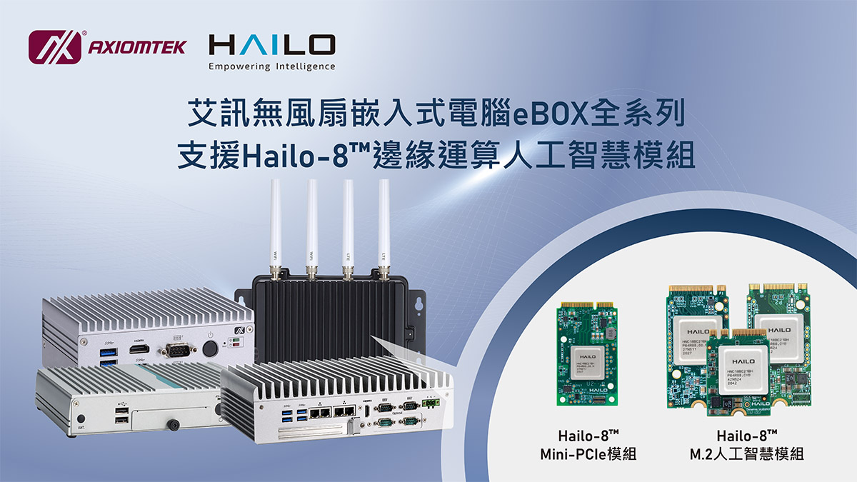 人工智能是现今制造业中改变传统规则的主流技术,艾讯持续研发生产最先进的工业物联网解决方案,成功支持客户多元项目。我们无风扇嵌入式电脑系统eBOX系列提供经济型入门款解决方案eBOX100系列、多功能嵌入式解决方案eBOX500/600 系列、可扩充解决方案eBOX700系列,以及强固耐用的运算解决方案eBOX800系列等完整的产品线。作为无风扇边缘运算嵌入式平台设计专家,艾讯eBOX产品团队拥有优秀的软硬件研发、弹性模块化设计与精准的制造能力,可以协助客户实现任何项目,例如针对不同应用领域量身订做的冷却解决方案。即日起,有Hailo-8™ AI加速器的加持,不仅强化全方位竞争力,更加速轻工业、工厂自动化、机器视觉、机器人控制等相关应用领域的整合能力。