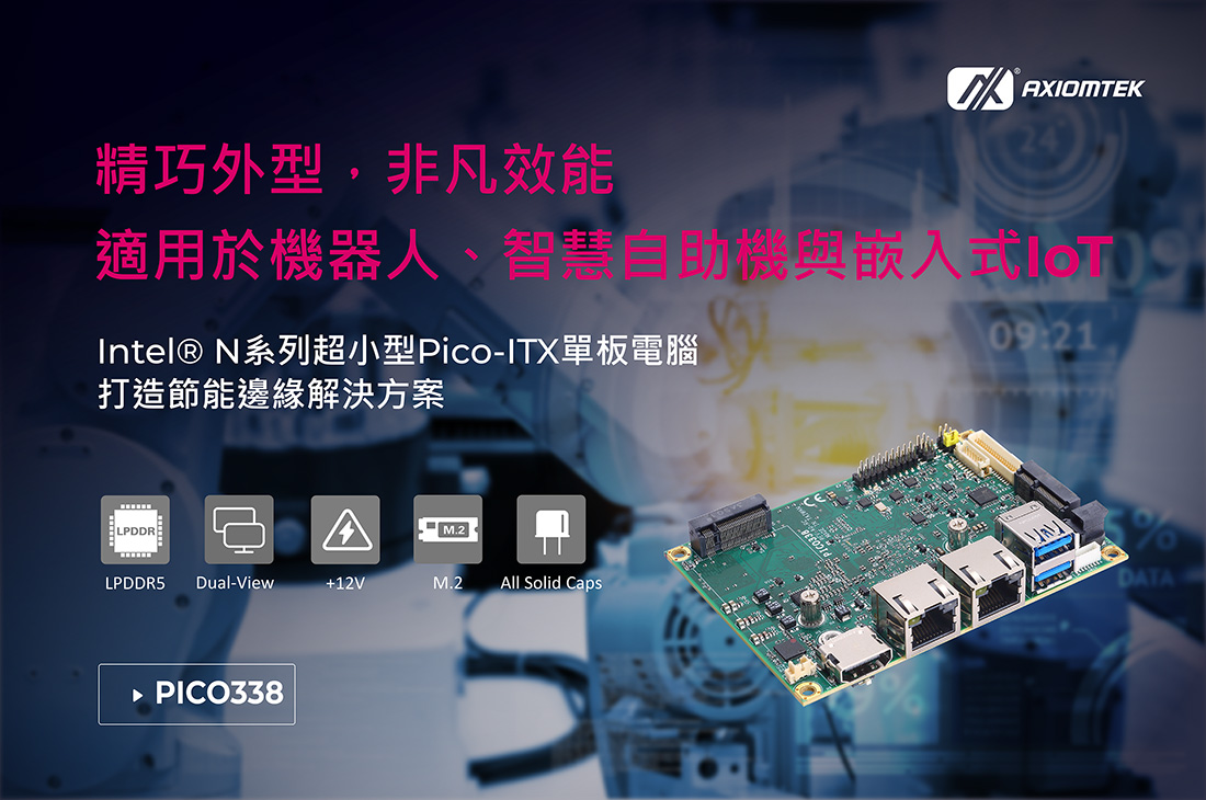 全球知名工业电脑领导厂商 - 艾讯股份有限公司 (Axiomtek Co., Ltd.),持续专注于创新、低功耗且可靠的工业电脑产品研发与制造。隆重推出新一代Pico-ITX单板电脑PICO338,专为机器人、物联网装置、边缘运算、嵌入式控制与零售资讯站等高效能且空间受限的应用场域而设计。
