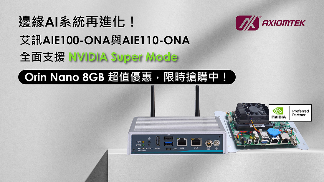 全球知名工业电脑领导厂商 - 艾讯股份有限公司 (Axiomtek Co., Ltd.),宣布旗下两款高效能边缘AI系统AIE100-ONA与AIE110-ONA正式支持NVIDIA® Jetson Orin Nano™ Super,运算效能最高可达67 TOPS。即日起,两款产品以限时优惠价开放订购,协助客户以更具成本效益的方式加速AI应用部署。