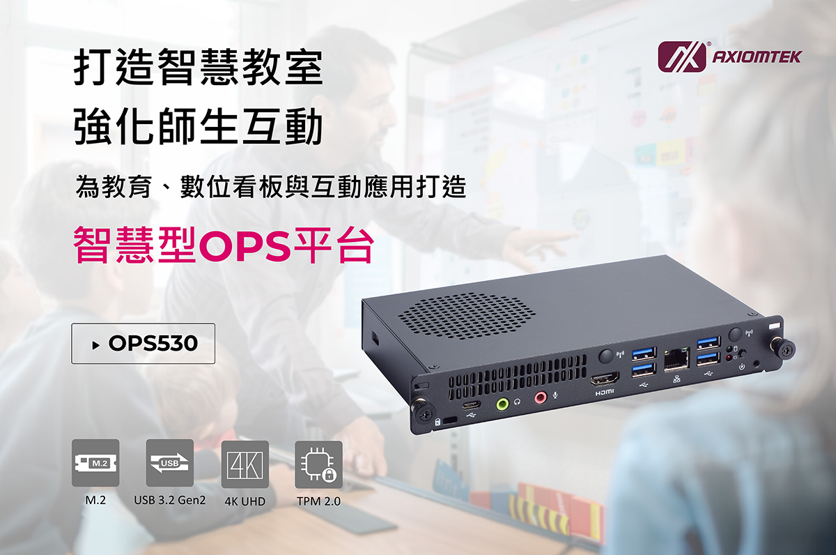 全球知名工业电脑领导厂商 - 艾讯股份有限公司 (Axiomtek Co., Ltd.),持续专注于创新、低功耗且可靠的工业电脑产品研发与制造。推出全新4K高画质数字电子看板播放器OPS530,完全符合Intel® Open Pluggable Specification (OPS) 开放可插拔规范,专为互动电子白板、互动平板显示器 (IFPDs)、数字看板与教育应用量身打造。OPS530结合强大运算效能、进阶图像处理与简化安装流程,打造新世代智慧显示应用全方位解决方案。
