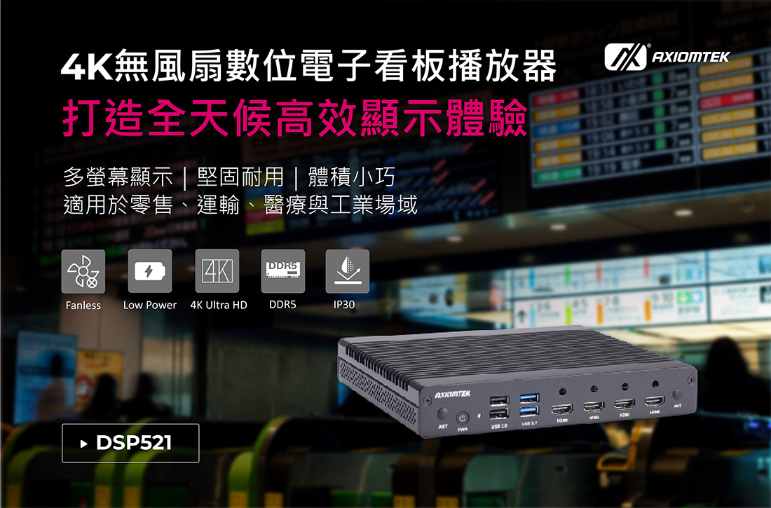全球知名工业电脑领导厂商 - 艾讯股份有限公司 (Axiomtek Co., Ltd.),持续专注于创新、低功耗且可靠的工业电脑产品研发与制造,正式推出全新数字电子看板播放器DSP521。这款体积精巧、效能强大的多媒体播放平台,专为24/7全天候稳定运作而设计,搭载Intel® Core™ i5-1335UE或Intel® U300E中央处理器,结合高效运算能力、工业级耐用性与先进显示技术,适用于零售、运输、医疗、饭店及工业等严苛环境,为多显示数字看板应用提供理想解决方案。.jpg)