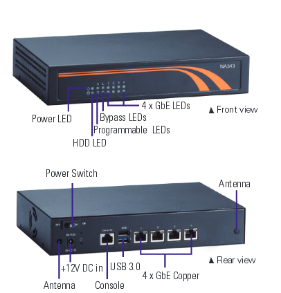 节能型NA343配备1 组2.5吋SATA硬盘机固定架与1组CFast™插槽等丰富的储存装置,并支援1组PCI Express Mini Card插槽,供无线网络/3G/LTE等网络安装,另配备1组RJ-45类型的控制埠与2组高速USB 3.0埠等输入/出界面;为方便系统维护,前面板配备LED灯号指示,使用者能有效率地随时监控电源、区域网络以及硬盘状态。此工业级网络安全设备还支援主流的Win7、WES7、Win8、WE8S以及Linux作业系统,提供管理与软件开发应用程序码,允许开发人员快速且轻松地完成他们的解决方案。